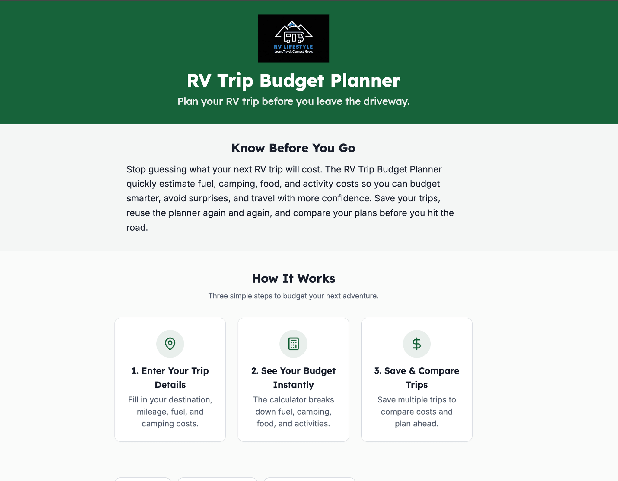 RV Trip Budget Planner - Web App for RV Travel Expense Tracking and Trip Cost Management, Instant Access