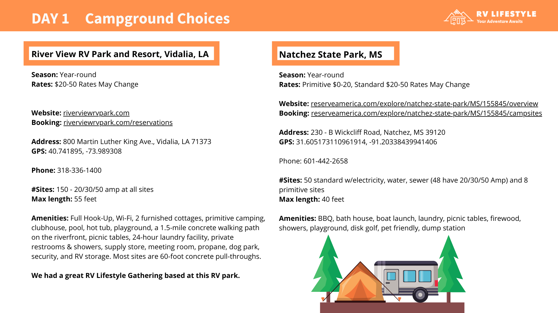 Each day includes recommended mileposts, campground options, places to eat, and links to points of interest along the route. You will also find helpful insights, reference links, and videos that add depth to each stop.
