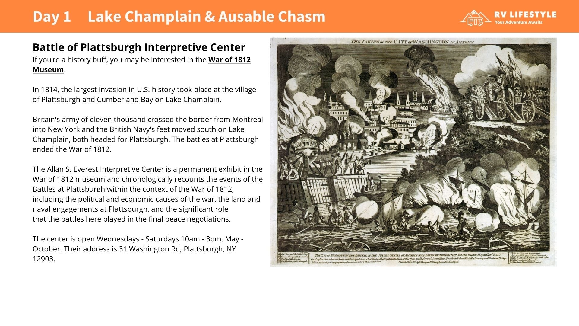 Ausable Chasm and the Lake Champlain area, campgrounds, scenic, and historic sites
