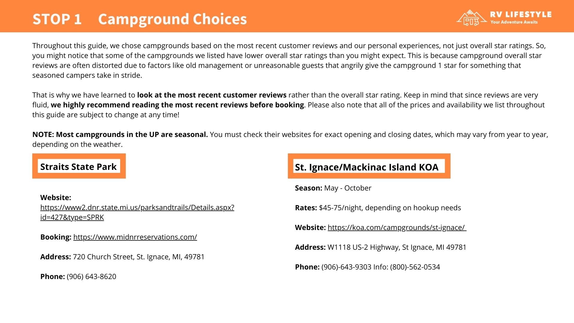 The campground recommendations alone were worth the price. Easy access, big-rig friendly, and close to the attractions. We did not waste time driving around searching for a place to stay, and we avoided overpriced tourist parks. That saved us both time and money.